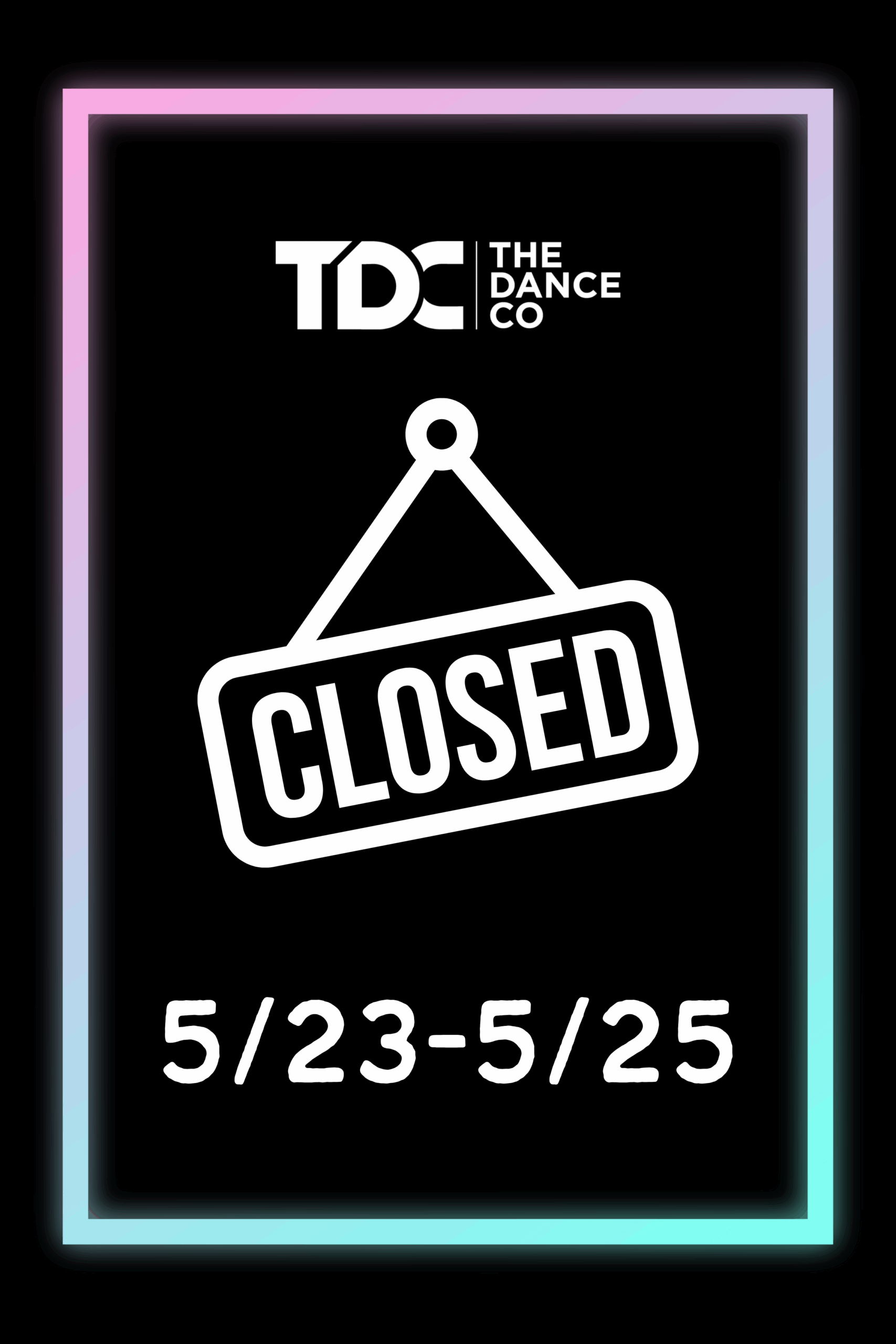 The Dance Co will be closed May 23rd through 25th in observance of Memorial Day.